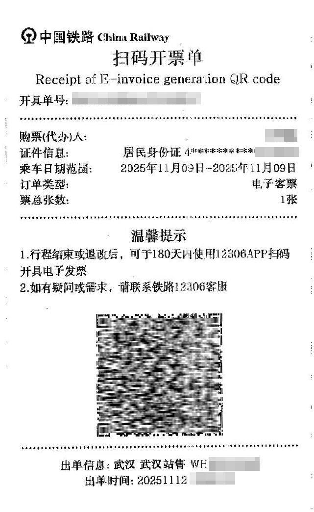 11月12日,李先生赶到武汉站售票窗口。工作人员让他出示身份证和订单号,然后打印出一张“扫码发票单”。李先生用12306手机扫描发票上的二维码,填写本人和旅客身份证号后8位,进入发票页面,填写发票抬头、税号等信息,获得电子发票。